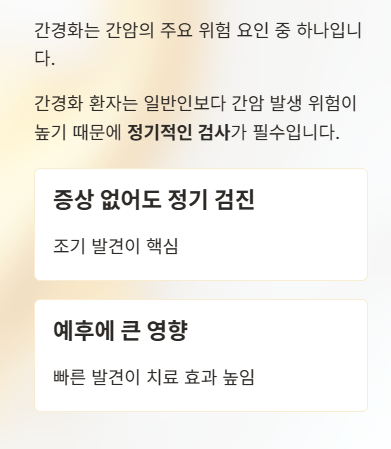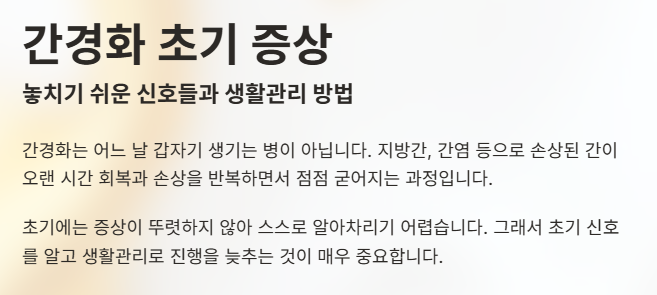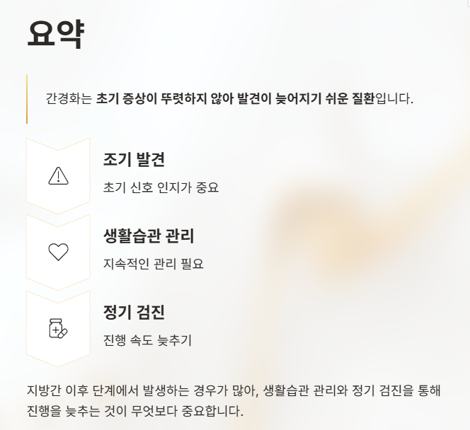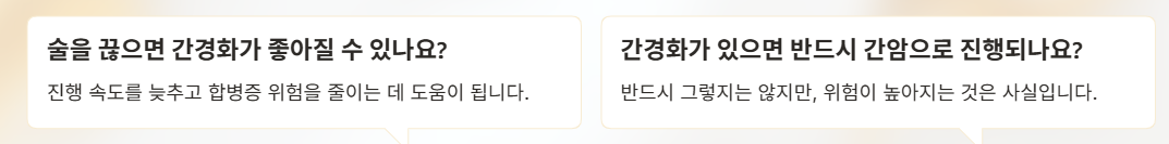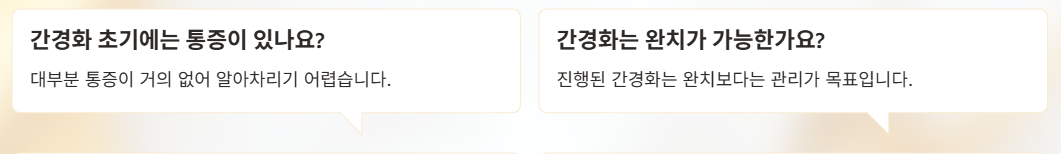 그래서 간경화는 증상이 나타났을 때 이미 상당 부분 진행된 경우가 많아, 초기 신호를 알고 생활관리로 진행을 늦추는 것이 매우 중요하다.