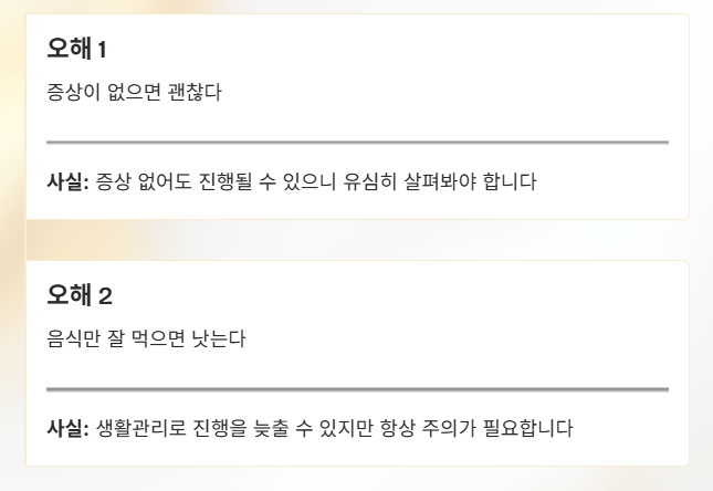 - 증상 없어도 진행될 수 있으니 유심히 살펴봐야 합니다.