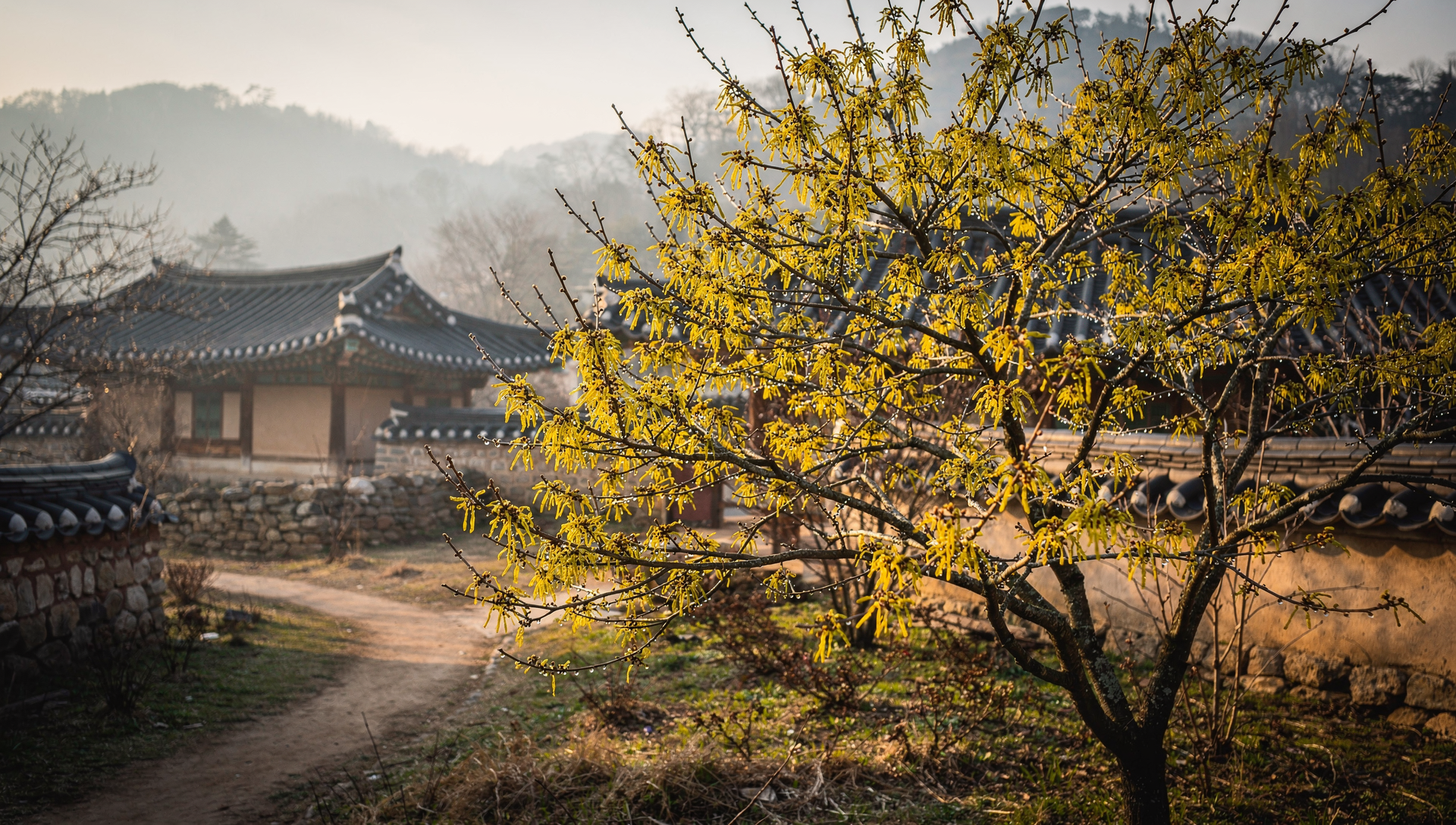 산수유는 나무 전체에 노란 꽃이 달리는 것이 특징이다. 2월 말부터 개화가 시작되며, 3월에 절정을 맞는다.
