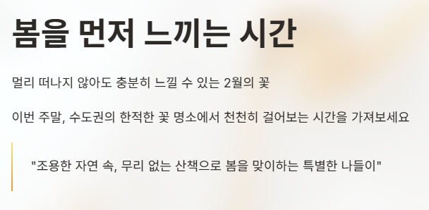 이 글에서는 2월에 수도권에서 가볼 만한 꽃 명소를, 걷기 부담이 적고 비교적 한적한 곳 위주로 정리해본다.