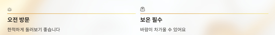 덕분에 인기 명소라도 비교적 조용하게 둘러볼 수 있고, 짧은 산책만으로도 계절의 변화를 느낄 수 있다.