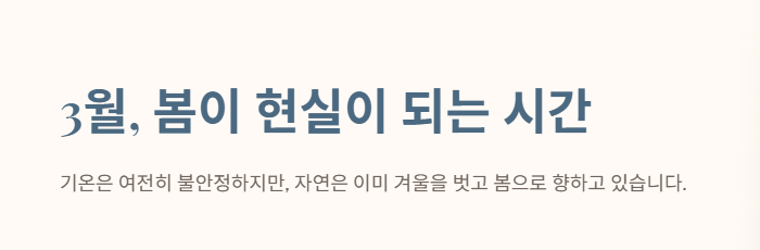3월은 ‘봄’이라는 단어가 현실이 되는 시기다. 기온은 아직 들쭉날쭉하지만, 자연은 이미 겨울을 벗어나 다음 계절로 넘어가고 있다.