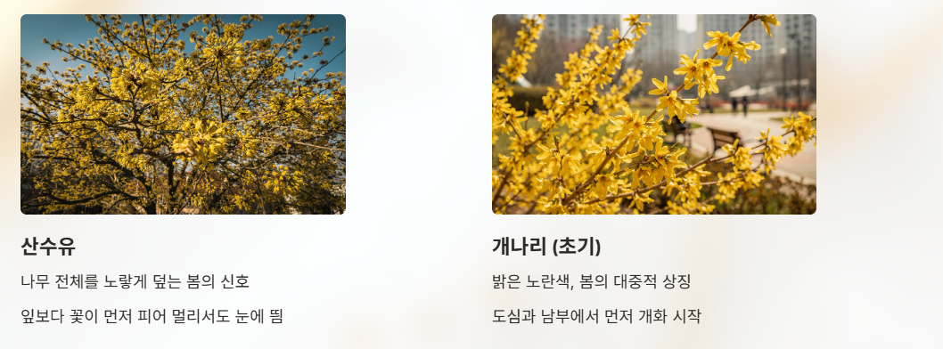산수유와 개나리로 시작해, 진달래와 목련을 거쳐 벚꽃과 유채꽃으로 이어지는 흐름은 자연이 만들어낸 계절의 순서다.