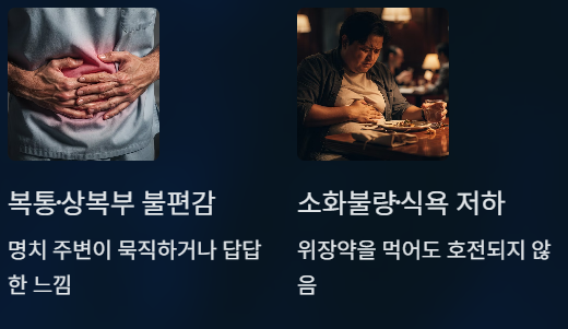 초기에는 날카로운 통증보다는 명치 주변이 묵직하거나 답답한 느낌으로 시작되는 경우가 많습니다. 통증이 애매해 병원에 가야 할 정도인지 판단하기 어려운 경우도 많습니다.
