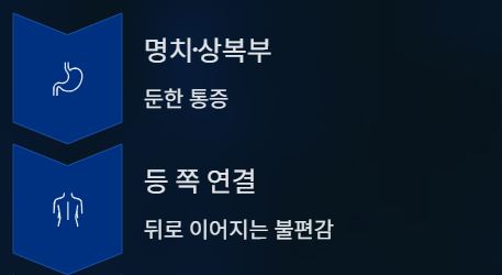 - 명치나 상복부 중심의 둔한 통증