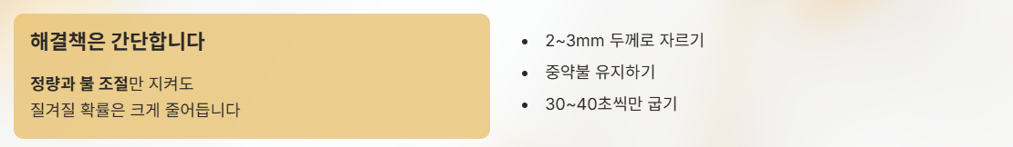 정량과 불 조절만 지켜도 질겨질 확률은 크게 줄어든다.