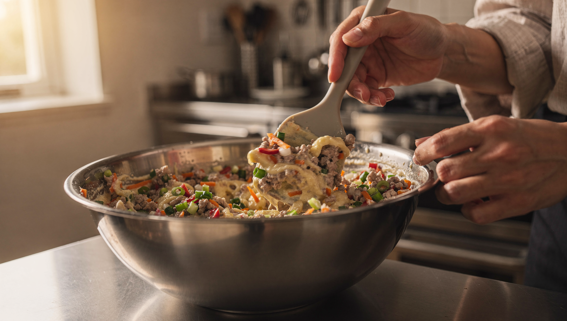 - 재료를 넣고 주걱으로 가볍게 섞기