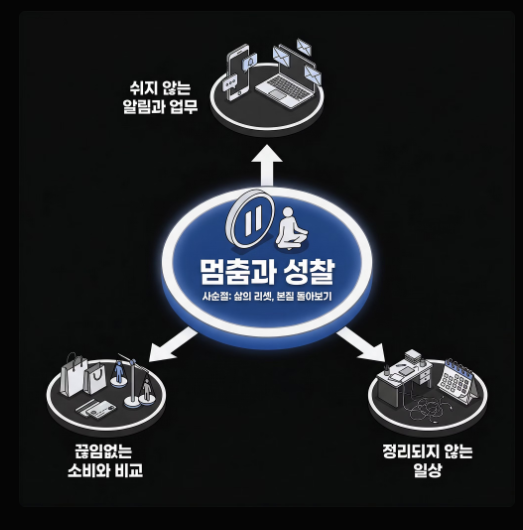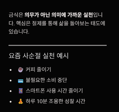 하지만 핵심은 음식을 줄이는 행위 자체가 아니라, 절제를 통해 자신의 삶을 돌아보는 태도에 있습니다.