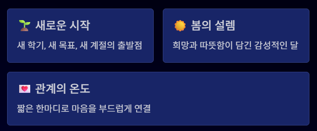 봄, 새 출발, 희망 같은 단어를 넣으면 3월 분위기를 살릴 수 있습니다.