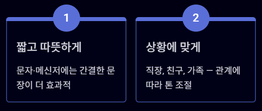 대부분 문자나 메신저로 보내기 때문에 짧고 따뜻한 문장이 좋습니다.