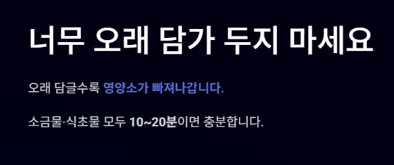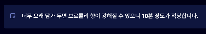 다만 너무 오래 담가 두면 브로콜리 향이 강해질 수 있으므로 10분 정도가 적당합니다.