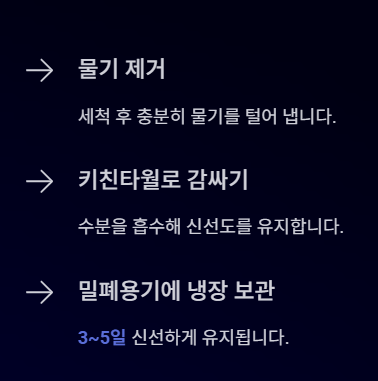 세척 후 오래 두면 수분 때문에 신선도가 떨어질 수 있습니다.
