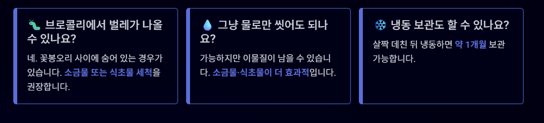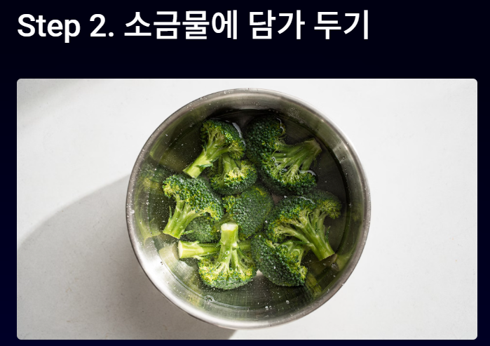 브로콜리는 꽃봉오리 구조가 촘촘하게 모여 있기 때문에 물로만 헹구면 사이사이에 숨어 있는 이물질이나 벌레가 완전히 제거되지 않을 수 있습니다.