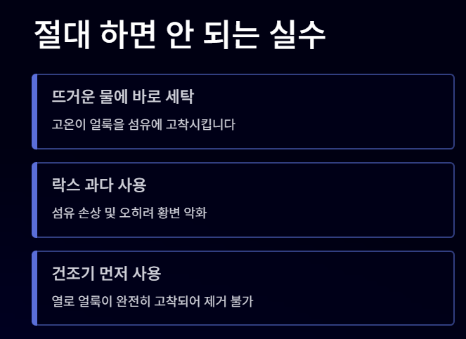 얼룩이 섬유에 고착되어 오히려 더 제거하기 어려워집니다.