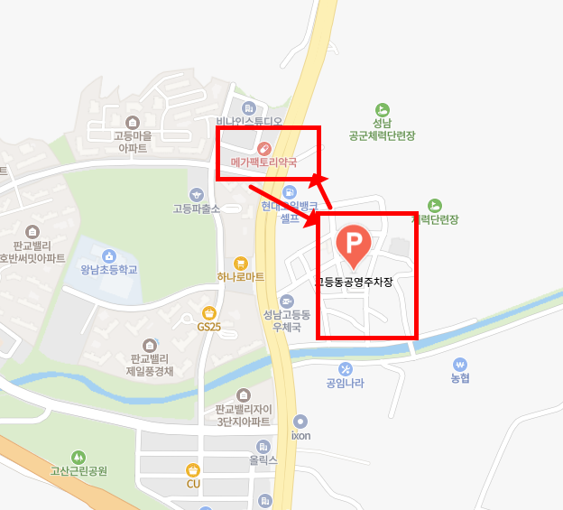 약국 주차장이용도 가능하지만 주차장이 혼잡시에는 가까운 공영주차장이용도 가능합니다. 고등동 공영주차장 위치는 성남시 수정구 고등동 397-3 에 위치하고 있습니다.