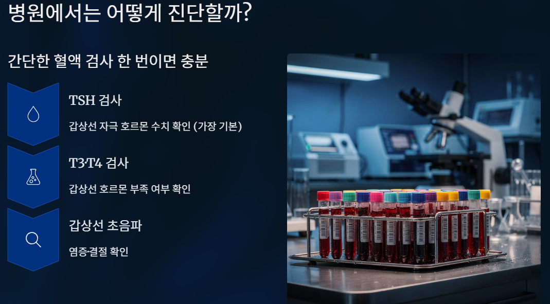 오늘은 갑상선 기능저하증 초기증상과 왜 중장년층 여성에게 흔한지, 그리고 병원에서는 어떤 검사를 받는지까지 정리해본다.