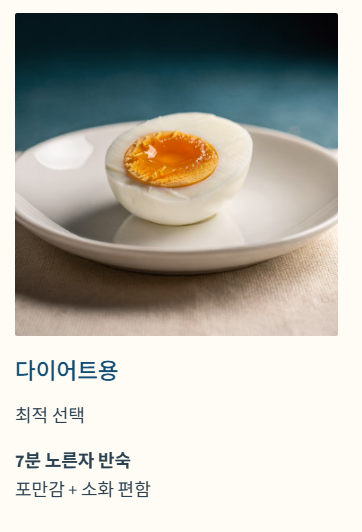| 촉촉 반숙 | 6분 | 노른자 흐름, 샐러드용 |