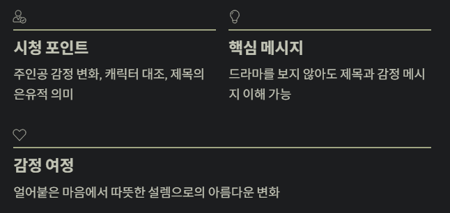 - 시청자는 주인공의 감정 변화와 제목의 의미를 함께 이해하면서 몰입할 수 있습니다.