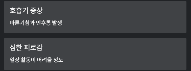 | 기침/목 통증 | 마른기침, 인후통 발생 |