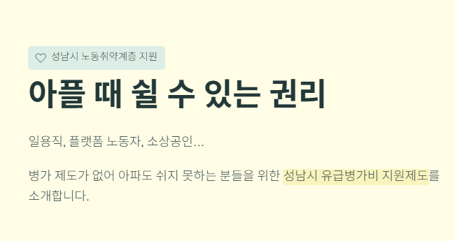 이런 위험을 낮추기 위해 성남시에서 ‘노동취약계층 유급병가비’를 지원하고 있다는 점은 꽤 의미 있는 제도입니다.