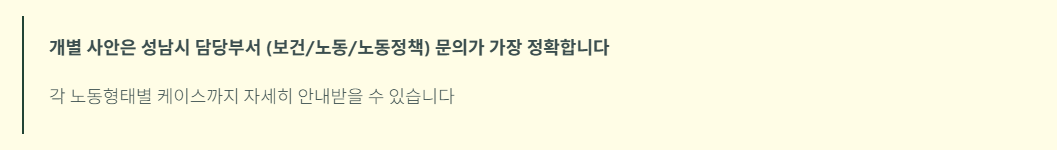 → 성남시 담당부서(보건/노동/노동정책) 문의 또는 행정 상담입니다.