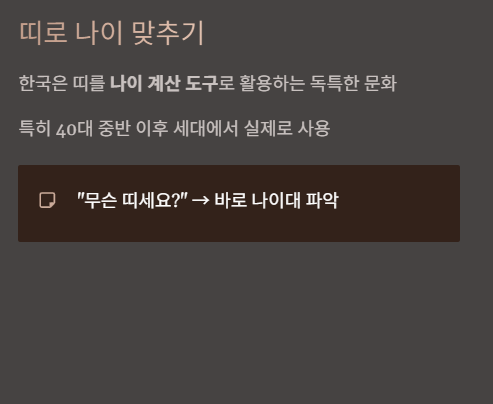 한국은 띠를 나이 계산 도구로 사용하는 특징이 강합니다.