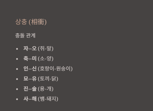 자–오(쥐-말) / 축–미(소-양) / 인–신(호랑이-원숭이) / 묘–유(토끼-닭) / 진–술(용-개) / 사–해(뱀-돼지)