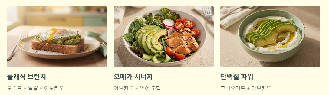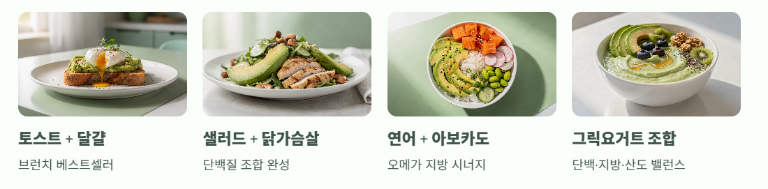 샐러드·브런치·식단 관리 메뉴에서 아보카도는 종종 올리브오일, 아보카도 오일, 견과류 오일 등 다른 지방 식품과 함께 조합되는 경우가 많습니다.