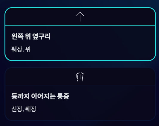 ✔️ 등까지 이어지는 통증 → 신장, 췌장