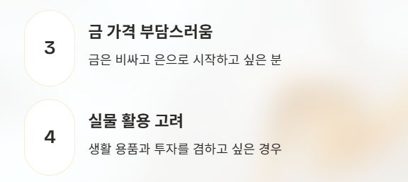 - 은: 비교적 저렴해 소액 분할 접근 가능