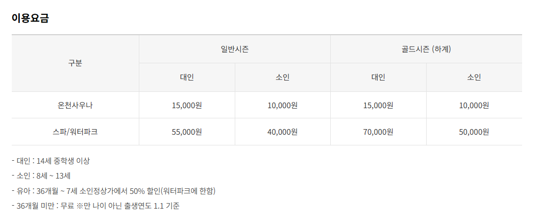 - 입장료: 스파·워터파크 패키지 기준 성인 25,000원~ / 어린이 20,000원~