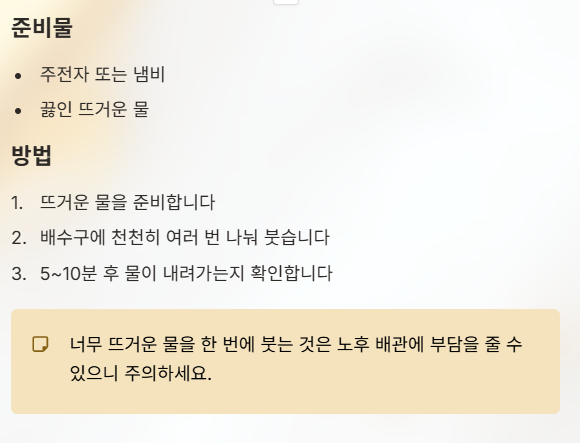 너무 뜨거운 물을 한 번에 붓는 것은 노후 배관에는 부담이 될 수 있으니 주의.