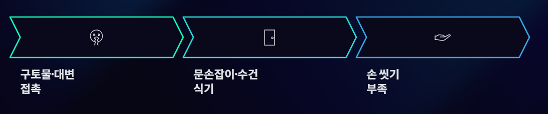 - 손·음식·물·표면 접촉으로 전파