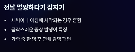 - 전날 멀쩡하다가 갑자기 증상 발생