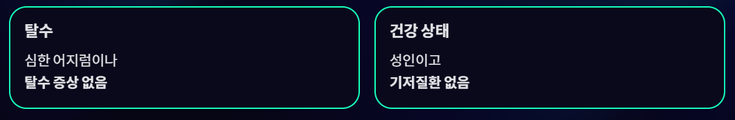 - 심한 어지럼·탈수 증상 없음