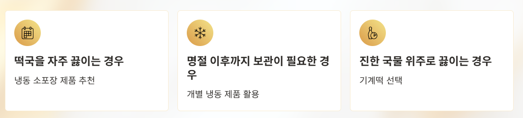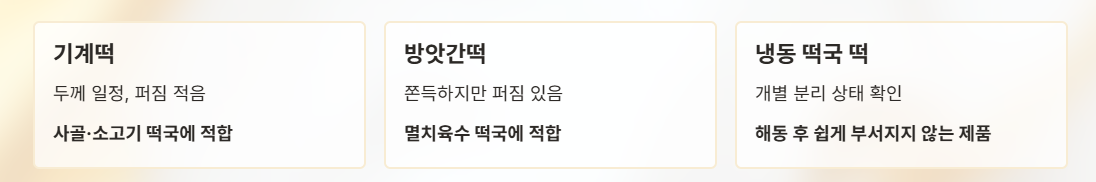 - 기계떡: 두께 일정, 퍼짐 적음 → 사골·소고기 떡국