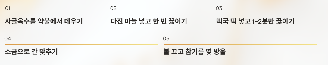 - 마늘 → 떡 순으로 넣고 짧게 끓인다