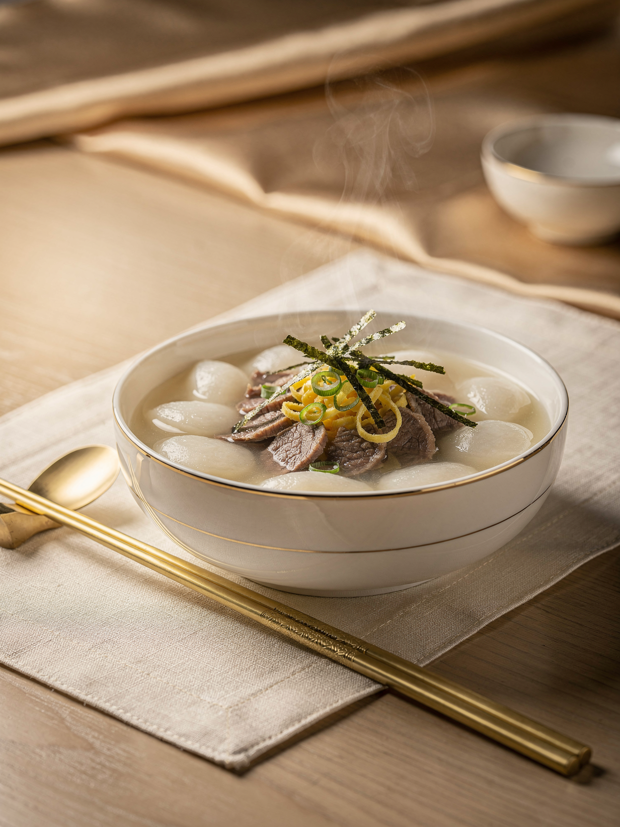 명절 떡국의 정석인 고기 육향이 국물의 깊이를 결정한다.