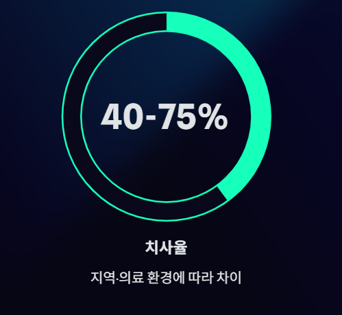 치사율은 **40~75%**로 보고되며, 지역과 의료 대응 환경에 따라 차이가 크다.