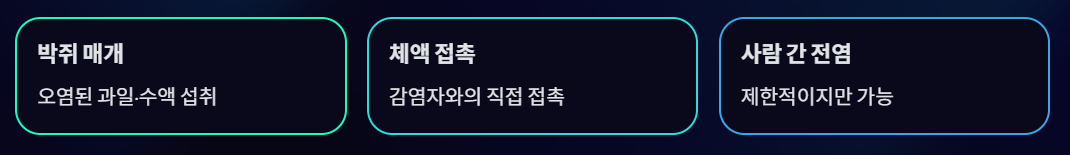 주요 전염 경로는 박쥐 분비물이나 감염자 체액 접촉이다.