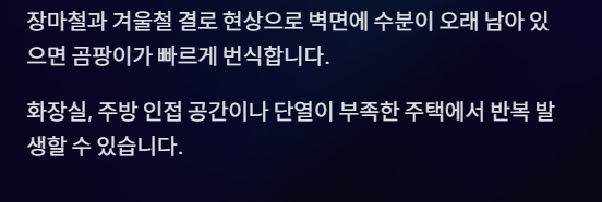 장마철이나 겨울철 결로 현상으로 인해 벽면에 수분이 오래 남아 있으면 곰팡이가 쉽게 번식합니다.