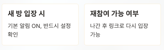- 관심 없는 방은 방 나가기 또는 조용히 나가기 기능을 활용하면 알림 부담을 줄일 수 있습니다.