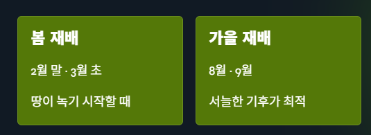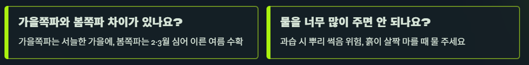 → 가을쪽파는 서늘한 가을에 잘 자라며, 봄쪽파는 2~3월 심어 이른 여름에 수확 가능합니다.