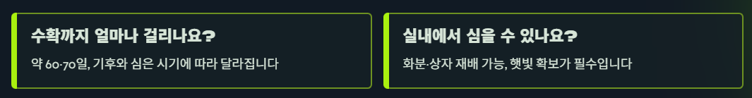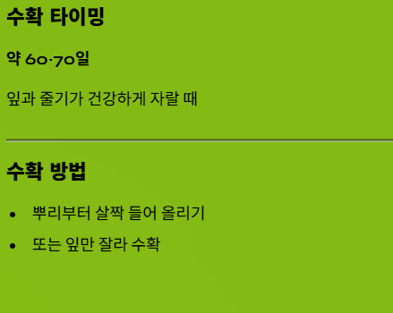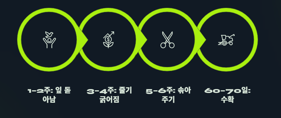 - 수확 시기: 약 60~70일, 잎과 줄기가 건강하게 자랄 때