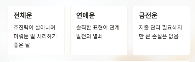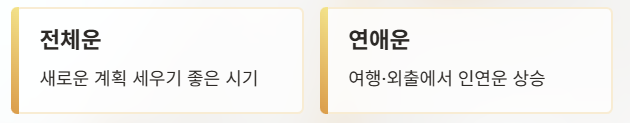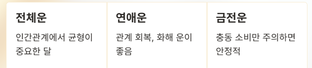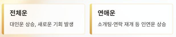 전반적으로 인간관계는 안정되고, 일과 금전에서는 기초를 다지고 방향을 정리하기 좋은 시기입니다. 연애운은 솔직한 소통과 배려가 좋은 결과로 이어질 가능성이 크며, 직장운은 꾸준함과 책임감이 인정받는 흐름입니다.