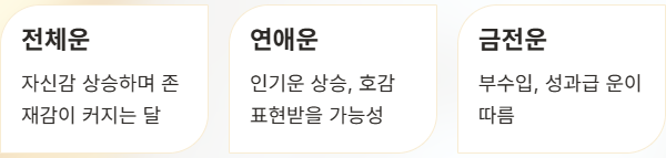 전체운: 자신감이 상승하며 존재감이 커지는 달입니다.