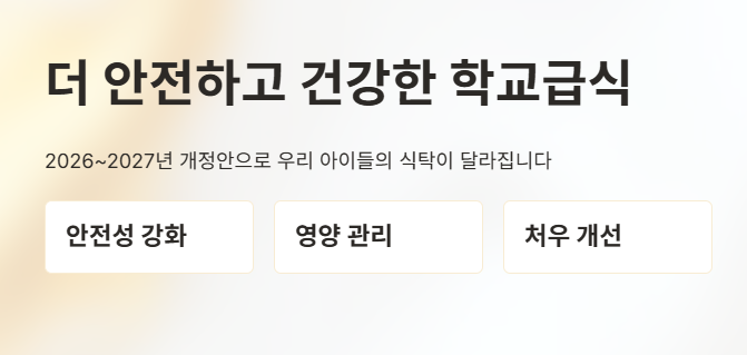 2026~2027년 시행 예정인 학교급식법 개정안은 학생 건강과 안전, 급식 종사자 근로 환경 개선, 안전한 식재료 관리 등 실생활과 직접 연결된 내용을 담고 있습니다.