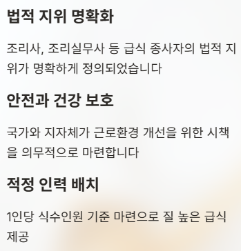 이번 개정안은 영양교사 배치 기준 명확화, 급식 종사자 근로환경 개선, 식재료 관리 강화 등 실생활에서 체감할 수 있는 변화가 포함되어 있습니다.