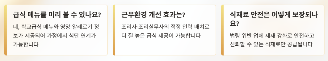 - 조리사·조리실무사 근무 환경 안정화, 적정 인력 배치, 건강과 안전 보호 시책 마련 등으로 질 높은 급식 제공 가능성이 높아집니다.