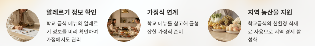 - 학교급식 메뉴와 가정식 연계 → 알레르기, 식습관 관리 용이